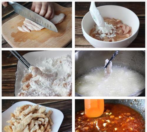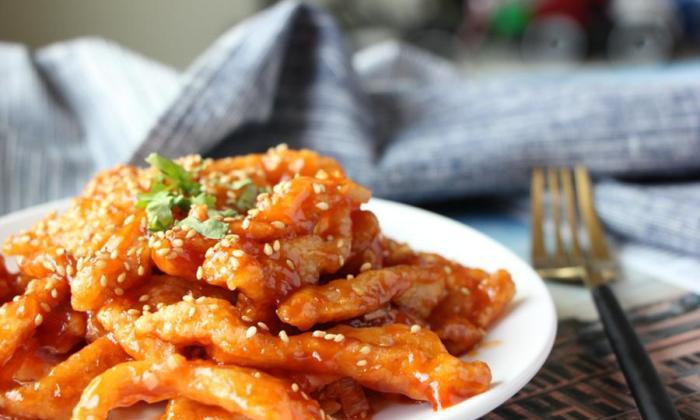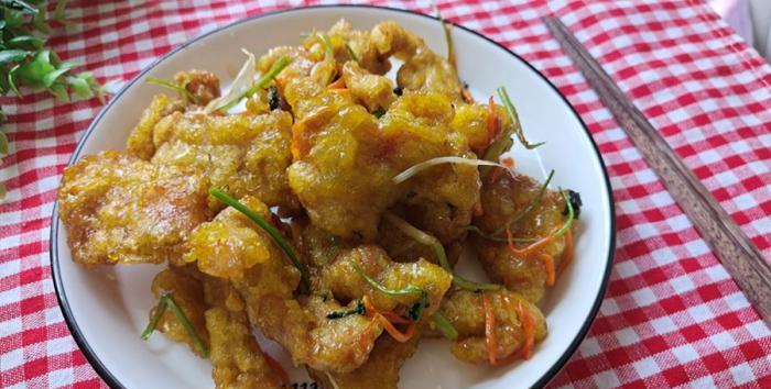 豬裡脊切片,用刀背拍打使其肉質更為鬆軟,裹上澱粉,再放入油鍋中炸至金黃,外酥內嫩,然後用小鍋加熱醋、豆醬、白糖調成酸甜的湯汁,最後將炸好的裡脊放入鍋中翻炒,使其均勻裹上調味汁,酸甜可口。