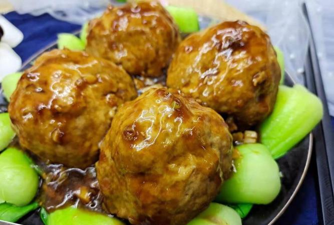 將豬肉剁成肉茸,加入鹽、蔥薑蒜、胡椒粉、雞精、麵包糠等,攪拌均勻,充分入味後,用手將其搓成大丸子,放入蒸鍋中蒸熟後,再入鍋中煎至兩面金黃,外焦裡嫩,口感豐富,味道鮮美。
