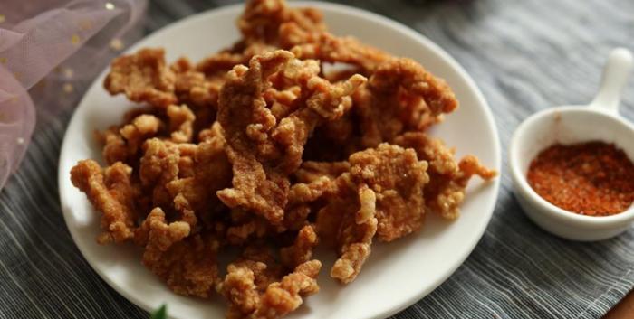 首先將豬肉切薄片,用鹽、胡椒粉、麵包糠醃製片刻,再放入油鍋中炸至金黃,最後撒上椒鹽,即可帶走油膩。