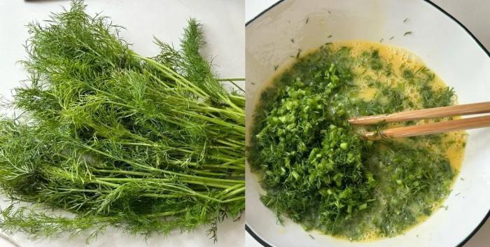 準備大概100克的茴香,清洗乾淨之後切碎加入鵝蛋裡面,攪拌均勻;
