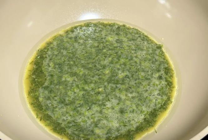 鍋中熱油,把茴香鵝蛋液倒進去,中火煎;