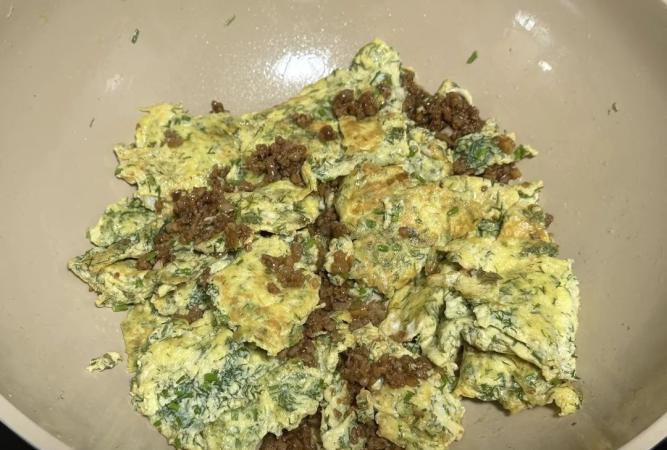 底部定型之後再慢慢翻炒至全部凝固;我還加了一點炒好的肉末,沒有的話也可以不加;